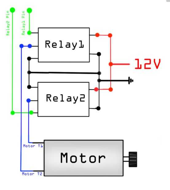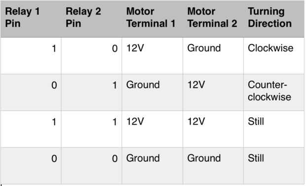 Esta configuración permite que el motor gire en ambas direcciones. Cuando solamente un cable verde es alto (conectado a 5V de arduino), un relé conmuta de tierra alta mientras el otro permanece en el suelo. Terminal un motor ahora está conectado a 12v mientras que el otro está conectado a tierra. Cuando conectamos 5V al otro cable verde y conecte el primer suelo, sucede lo contrario. La otra salida de relé está ahora en 12V mientras que el primero de ellos ahora está conectado a tierra. Esto hace que el motor gire al revés. Cuando dos cables verdes son altos o son bajos, el motor no girará porque ambos de sus terminales son conectados a la misma tensión.