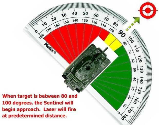 Cuando se detecta un objetivo, los pivotes del vehículo y los recipientes de servo en direcciones opuestas hasta que el objetivo es "directamente a continuación". En el caso de la ilustración proporcionada, se ha detectado un objetivo a 45 grados, por lo que el centinela pivoteará hacia la derecha manteniendo a pan izquierda hasta el ángulo del servo pan muestra el objetivo de estar en algún lugar en el rango de 80 a 100 grados.