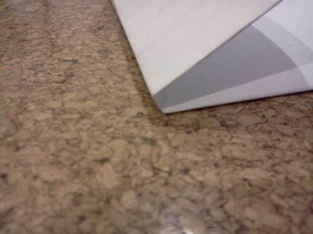 Este es el paso más difícil. Hacer dos pliegues 0,5 cm una de otra, en el otro extremo. Desea la solapa superior para descansar en el ~ 45 grados del plano y el segmento medio a ~ 30 grados en dirección opuesta. Otra vez se refieren a las imágenes, lo hace todo más claro.