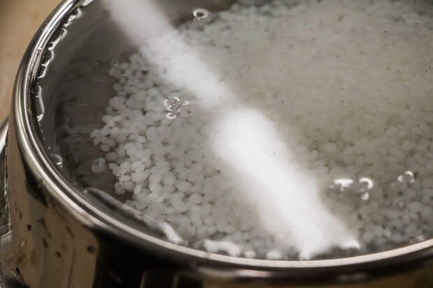El producto llegó a nuestro makerspace en bolsas de pequeñas cuentas blancas. Vertimos en una bolsa entera para este proyecto, pero si están haciendo algo más pequeño, basta calentar lo que usted necesita. Toma unos minutos para convertirse en clear(ish), que indica que está listo para moldear. Mantener el agua o por encima de 150° f.