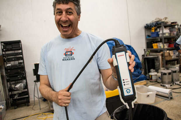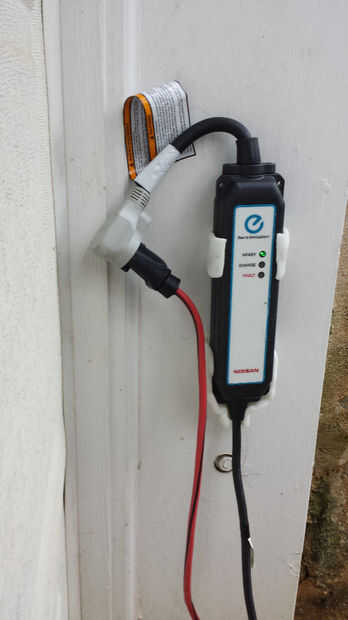 Ahora, cuando estés listo para cargar su vehículo, simplemente deslice el transformador en los soportes, entrando a ellas desde la parte superior y luego enchufe en ambos extremos.