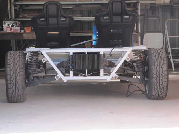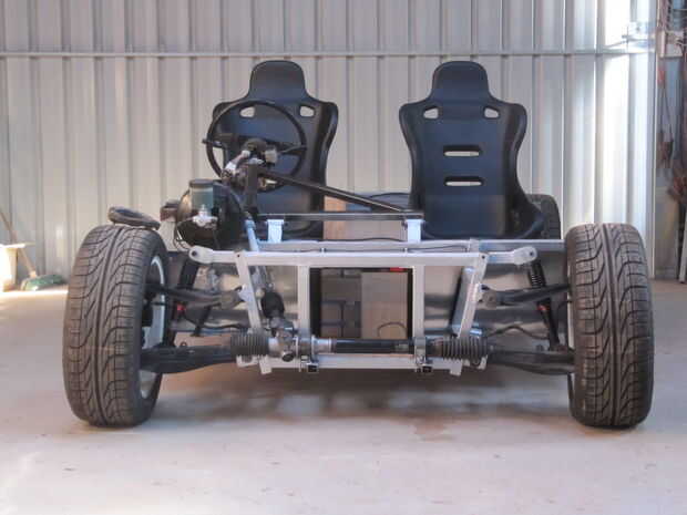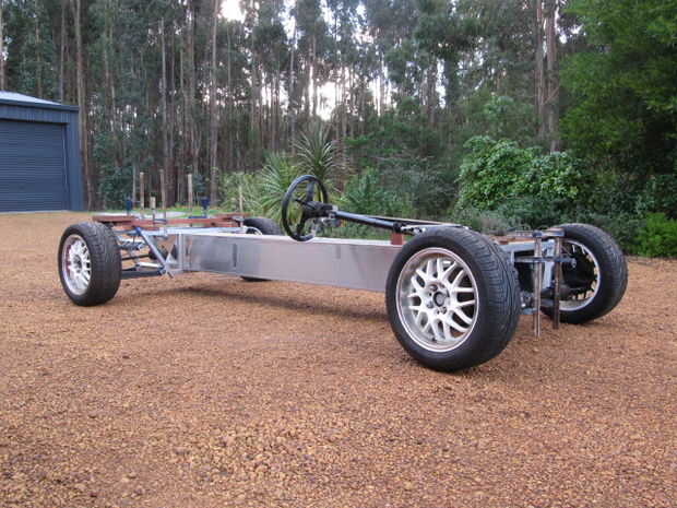 Los subchasis delanteros y traseros montados en la caja del chasis se demuestran arriba. Los puntos de montaje de suspensión son visibles en las fotos. El ángulo de los miembros del exteriores coincide con los soportes de suspensión.