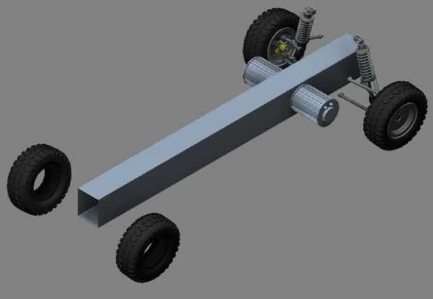 Un dibujo que muestra las dimensiones para una caja de chasis arriba se muestra junto con Autodesk Inventor rendering que muestra el diseño básico del chasis. El diseño de la caja del chasis es optimizado 45 celdas de litio de 100Ah CALB equipado todo el cuatro.
