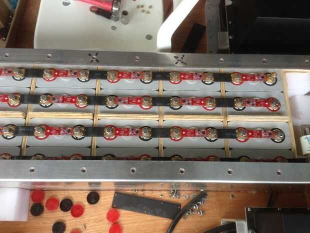 Los motores y controladores que estoy usando operan 144 voltios por lo que he usado 45 células de litio en serie. La corriente máxima es 600 amperios durante breves períodos con un máximo de corriente por períodos más largos de 300 amperios, por lo que he utilizado células de 100Ah para limitar la corriente a entre 3 a 5 Esto le da un paquete de baterías de 14kWh, que es un poco más de la mitad de la capacidad del paquete de baterías del Nissan Leaf 24kWh.