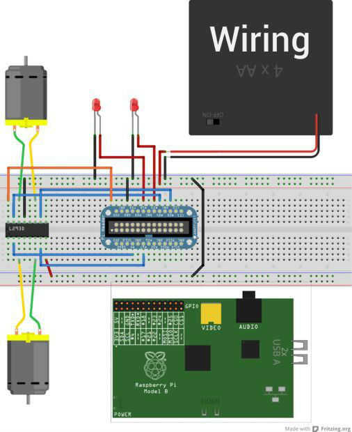 Aquí tenemos los motores conectados al chip L293D. El chip L293D está conectado con el zapatero de Pi, que es. Para más ayuda visite: Control de motores de corriente continua