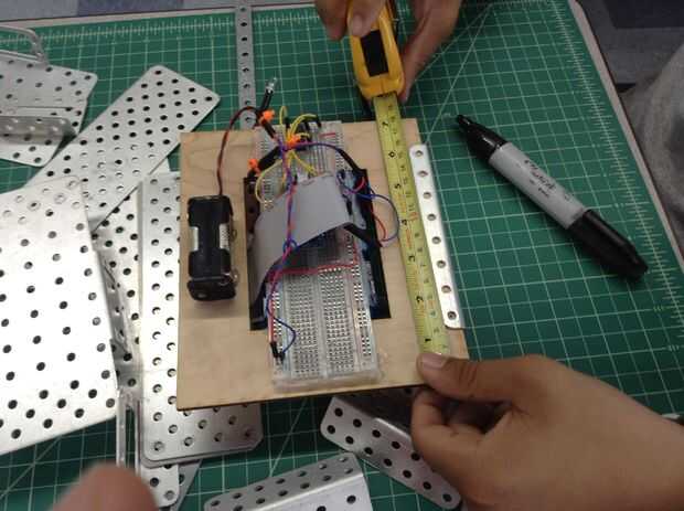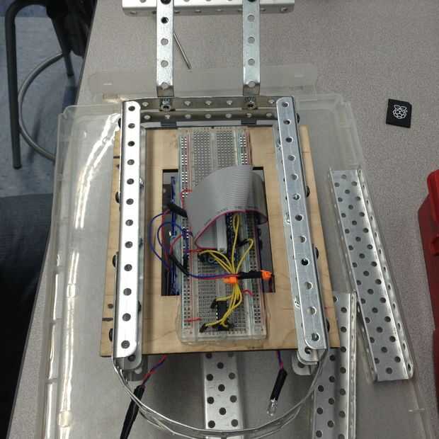 Para construir el marco, primero láser cortar un marco rectangular y con un agujero rectangular en el marco de la frambuesa pi. Entonces, nos pega la placa encima de la frambuesa pi (con la frambuesa pi centrada verticalmente debajo de la placa). Con esta instalación, podríamos colocar el tablero de pan en el marco de madera con la frambuesa pi pegarse a través del agujero rectangular para facilitar el acceso a los puertos por debajo. Luego, utilizamos vigas robótica matriz para construir alrededor de la estructura de madera. Utilizando acrílico construimos una caja rectangular (con agujeros que láser a través de ella) para mantener los ejes y los engranajes de la rueda. Para nuestra instalación, usamos un árbol para cada rueda. Luego, simplemente pegados los ejes y bujes de eje a través del orificio y adjunta los engranajes a los ejes traseros. Después de esto se hizo, atamos las ruedas en el eje y uso pegamento para sujetar en posición para que no se mueva de lado a lado.