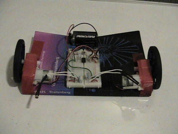 En este punto usted tiene realmente un vehículo de Braitenberg funcional, solo tienes que poner s fije una plataforma para que las ruedas en él y adjuntarlo a una plataforma. Estoy todo sobre el gheto stylez, así que solo graba mi robot a un libro. Sin embargo, si usted quiere algo un poco más permanente, entonces por favor no dude me demuestran para arriba.