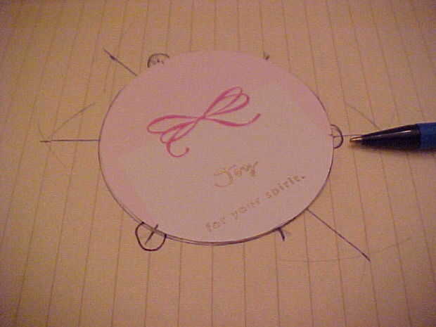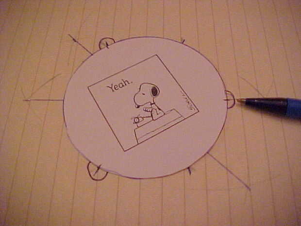 Todas las tonterías anteriores fue para poder utilizar la plantilla que sólo hizo para marcar todos los círculos rápidamente para su puntuación y plegable. Coloque un círculo en la plantilla y haga una marca pequeña en el círculo donde los pliegues deben ser. Sí, mi plantilla es diferente. Tratando de usar la brújula tonta para hacer un triángulo equilátero sólo funcionaba hacia fuera. Para cada uno de los 20 círculos, marcar los tres puntos.