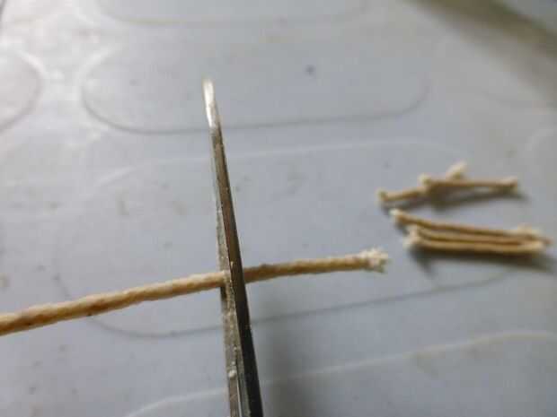 - Cortar la mecha empapada en cera pedazos de una pulgada. Utilizaremos estas mechas para las velas del hemisferio.