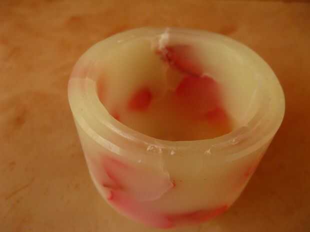 Puede hacer cáscaras de huracán con pétalos de flores incrustadas, hojas secas y flores, perlas de vidrio, trozos de cera y fotografías incluso. Aquí he usado pétalos de rosa para incrustar en un pequeño huracán.