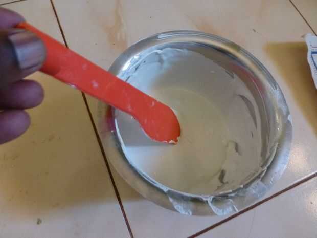 - Pesan unos 150 gramos de base y 7,5 gramos de activador en un tazón y mezcle bien. Una mezcla adecuada de activador con la base te dará un molde de excelente calidad. También asegúrese de que ningún aire se queda atrapado en la mezcla.