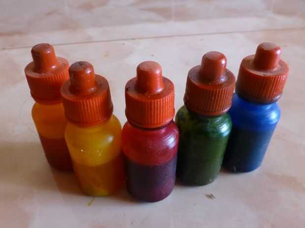 Los colorantes líquidos se pueden agregar directamente a la cera en baño María. Velas de gel se hacen solamente con colorantes líquidos.
