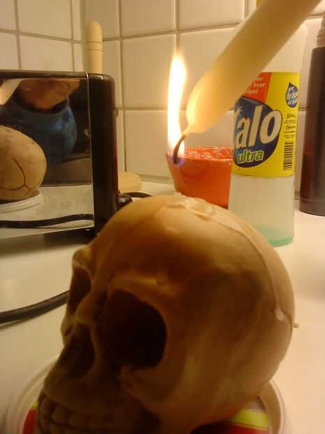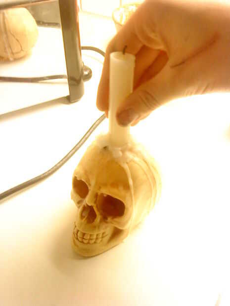 Para este paso usted va a necesitar paciencia. Corte la vela por la mitad con le cuchillo/tijeras. La parte superior de la vela la luz y empezar a goteo de la cera en la parte superior del cráneo. Tan fácil como eso. Te recomiendo para hacer una sola capa y dejarlo antes de aplicar otra capa. De esta manera no derrame la cera a los lados y tendrá menos tiempo para hacer una "pila" en la parte superior del cráneo. Después de haber hecho una tirada de cera en la parte superior, tome la parte inferior de la vela y presiónela sobre la cera mientras que su todavía caliente. Deja que se enfríe y ahí lo tienen! tu vela cráneo propio!