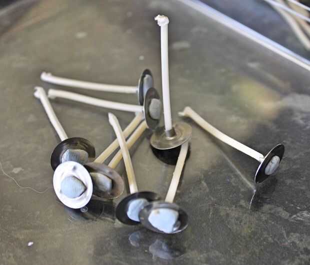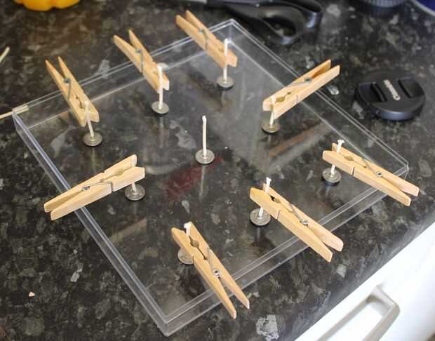 Use pinzas para mantener tus mechas de pie cuando usted vierte cera caliente a su alrededor, equilibrar las clavijas alrededor del borde de la bandeja.