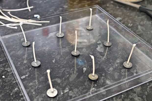 Bluetack a la parte inferior de tus mechas de vela acortado del palillo y luego en secuencia a lo largo de la parte inferior de la bandeja de plástico. Utilicé una rejilla de 3 por 3 para que cuando se enciende la vela de la cera se derrita uniformemente.