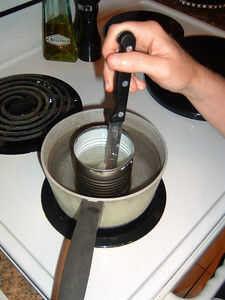 Una vez que el agua está caliente, pueden lugar cubos de cera en el aluminio. Con un cuchillo, revolver los cubos hasta que se derritan completamente. Añadir cubos de olor, (seguir la dirección en el paquete). Remover otra vez.