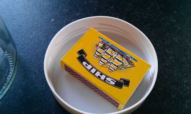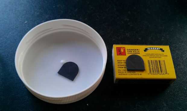 Separe sus imanes y pegar uno en el interior de la tapa y otro para la caja de fósforos - mire hacia fuera para asegurarse de la posición de la caja en la tapa - que todavía se atornille a la jarra.