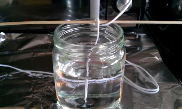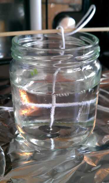 Envuelva la parte superior de la mecha alrededor de algo que se siente en la parte superior de la jarra hasta que la cera seque - he usado un pincho de brocheta