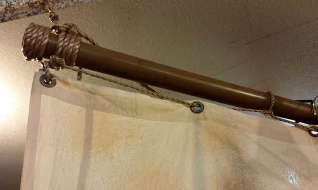 Para la vela, he comprado algunos muselina por un precio ridículamente bajo en telas de Jo-Ann. He comprado tres yardas (vertical) de 120" muselina ligera de ancho (horizontal) por aproximadamente $7.00 con un cupón. He transferido las dimensiones de la esquina a la muselina y utiliza un trozo de tubo de PVC de pequeño diámetro que tenía puesta alrededor de trazar los swoops en los lados. Luego córtelo hacia fuera y mi esposa había dobladillado los bordes. Tenía sus hacer pequeños dobladillos en los 2 lados para evitar que se deshilache. A lo largo de la parte superior, hizo hacer un 1 ½" dobladillo para hacer espacio para los ojales. A lo largo de la parte inferior, hizo hacer una 2 ½" dobladillo que estaba abierto en los 2 extremos por lo que pude pase un pedazo de cuerda por el dobladillo para darme el look billowing iba para.