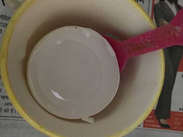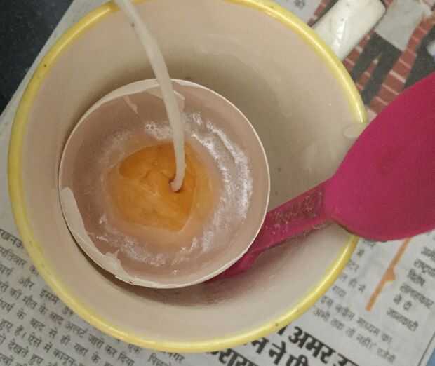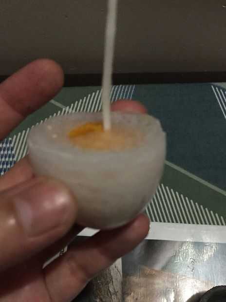 una vez que la mecha esté segura dentro de la cáscara, vierta la cera más llenando 2/3 de la cáscara de huevo.