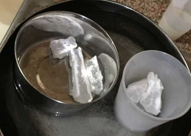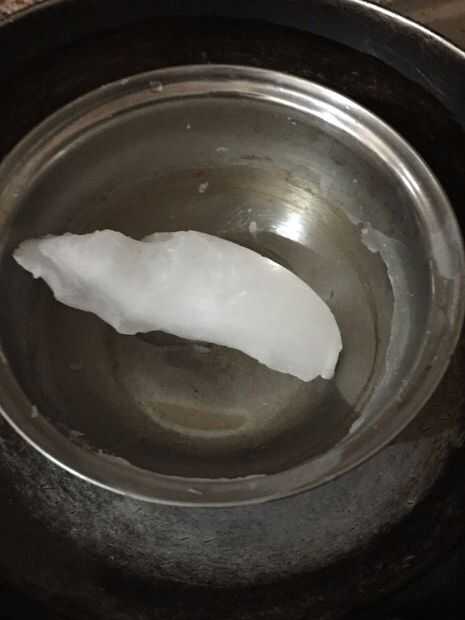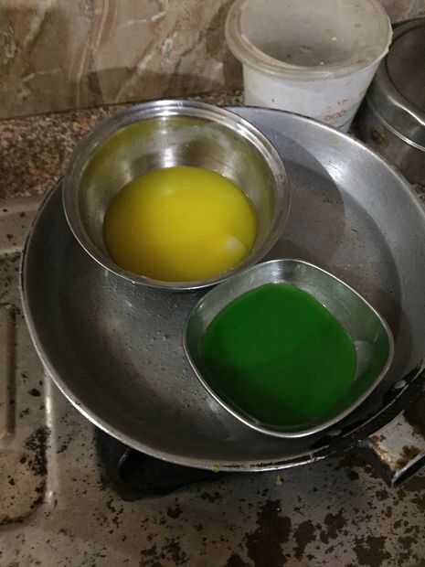 Coloque bloques de cera de parafina en ellos (utilice el bloque más pequeño para la yema y un poco más grande para clara de huevo) y calor (es un método de baño María)