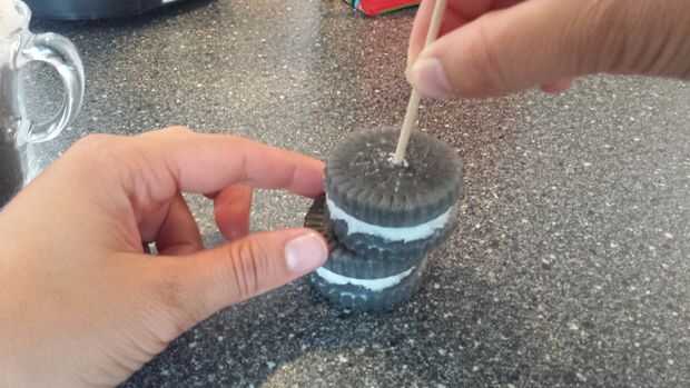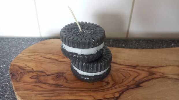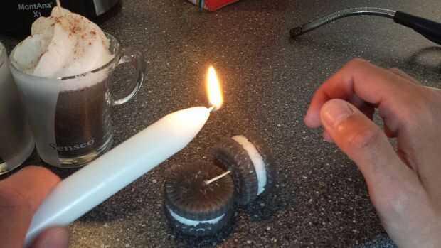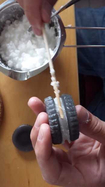 • Añadir la cera un poco encima de la primera galleta, lo hicimos encendiendo una vela y goteo de la cera en la cookie.