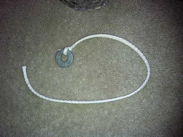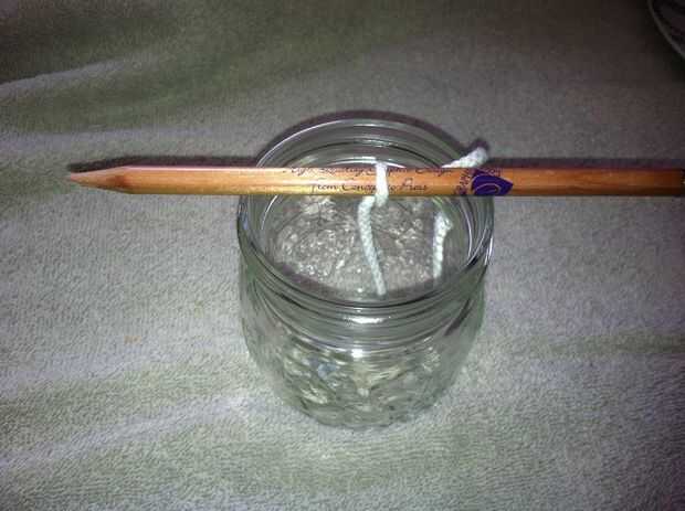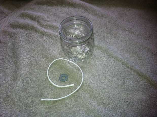 Até una arandela pequeña a un extremo de la mecha para el peso. El otro extremo estaba atado a un lápiz para que la mecha colgada en el centro de mi tarro dle hombre.
