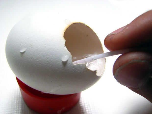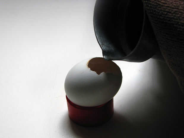 No pierdas tiempo, la parafina se convertirá en sólido otra vez muy pronto. Llene la mitad del huevo con parafina fundida. Entonces puso un pequeña pábilo y sostenga con su mano hasta que llega a ser fijo (unos 20 segundos).