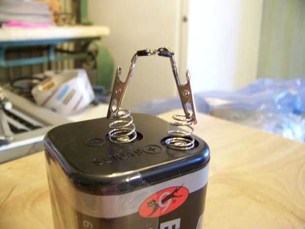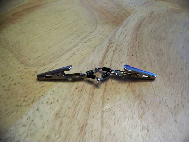 Springclips de una batería de linterna puede ser frustrante para fijar cosas a. Decidí pinzas eran la mejor solución. Se implican soldadas en las entradas del puente de diodo y dobló a la batería.