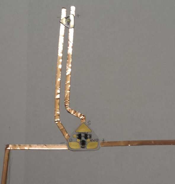 Ahora es el momento para agregar etiquetas a tu circuito! Recuerde colocarlos para que sus almohadillas conductoras en contacto con la cinta de cobre que ha establecido y pegar hacia abajo firmemente para asegurar una buena conexión. El circuito debería verse algo como la anterior.