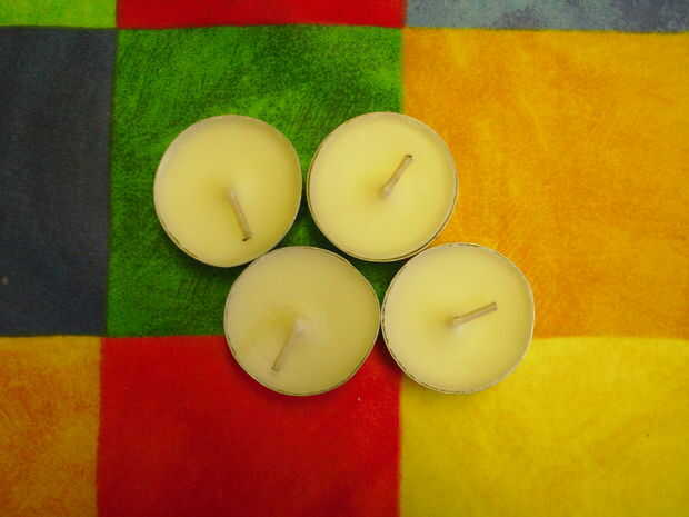Todo lo que necesitas para hacer esto es Una lata pequeña de menta (lata Altoids) Tarro de cristal o cualquier otra cosa para derretir la cera en Cuatro velas ligeras del té Caja de fósforos Poco de pegamento