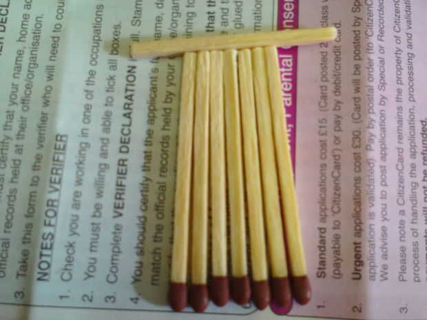 Entonces pegué a un palo de fósforo y 7 partidos y lo colocó en la tapa, esto hace muy fácil de sacar uno cuando lo necesita.