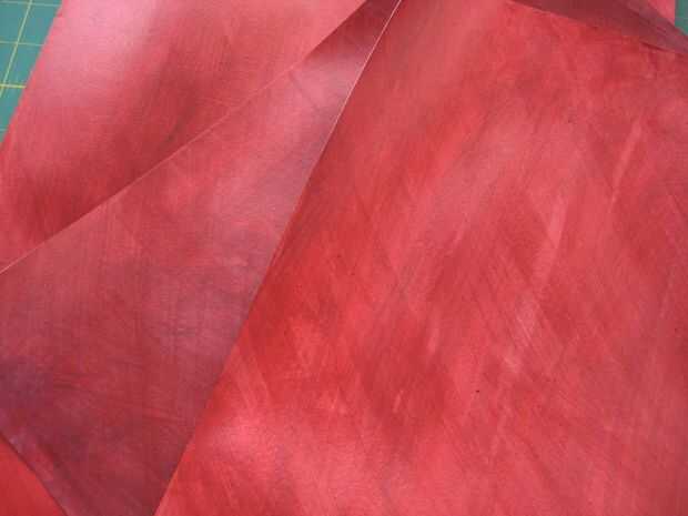 Quería un color oxblood rojo. Capas de capas de pintura acrílica en el papel, sobre todo en alizarina carmesí, pero con algunos cobre antiguo para mantener el color caliente y algunos dioxazine púrpura para variar un poco los tonos rojos. Seguir añadiendo capas de barniz hasta llegar a un color que te gusta - el color cuando está mojado es más importante, como los pasos de acabado le dará un aspecto permanentemente húmedo.