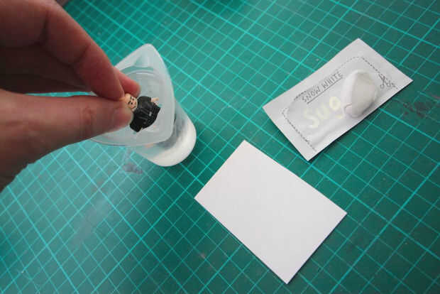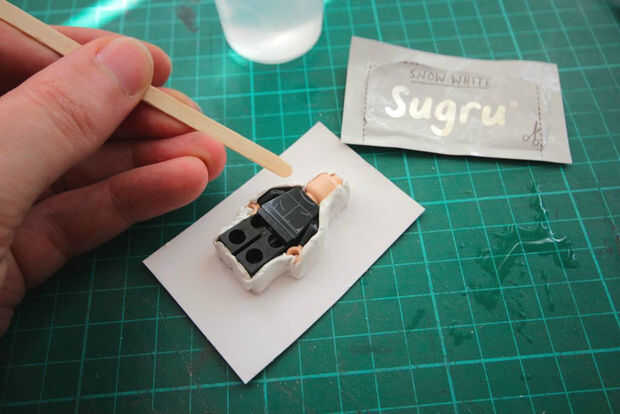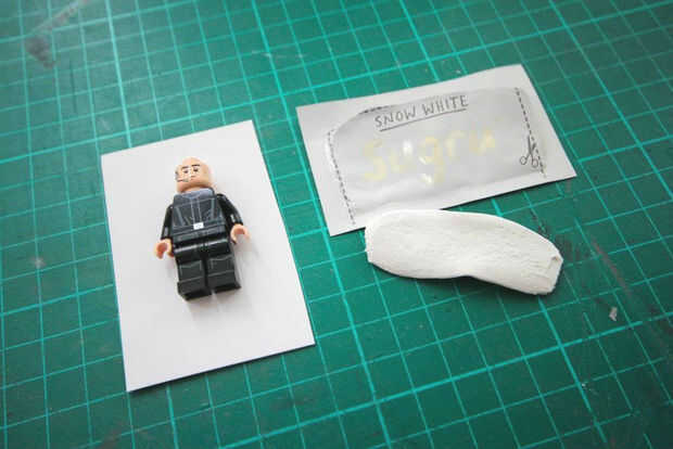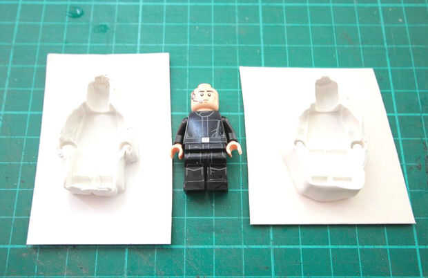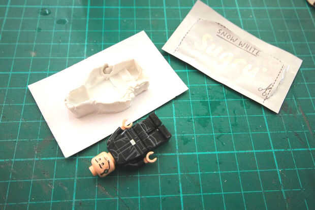 - El Sugru se aplica a un trozo de papel/de la tarjeta y presione la minifigura de Lego en ella. Luego, usando los dedos (o incluso un agitador del café), empuje el Sugru en el contorno de lo Lego. Trate de dejarlo por encima del nivel del Lego como se muestra. No pasar demasiado tiempo en esto, o comenzará a pegar después de 3-5 minutos.