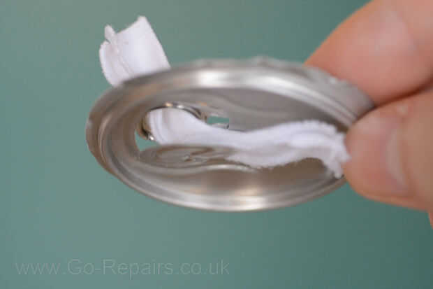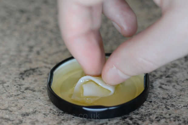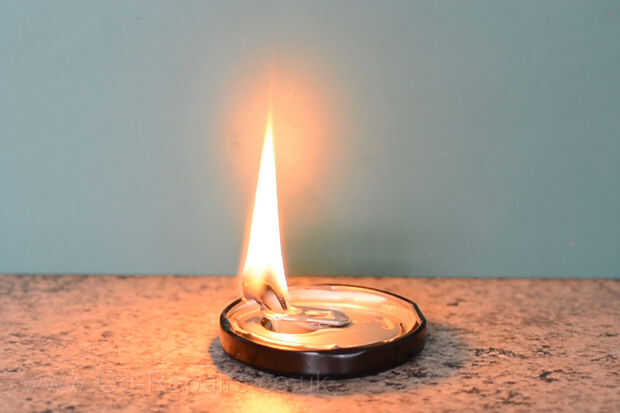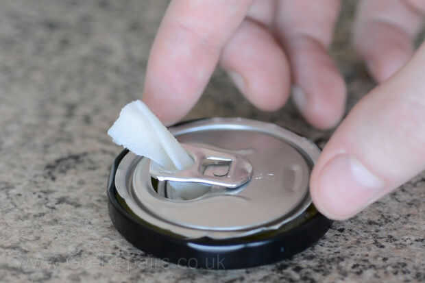 Ahora sumerja su mecha en algunas del aceite. Tome la parte superior salvó de su cola puede batería y alimenta la mecha por la parte superior. La mecha la alimentación a través de la poder del tirón del anillo y el labio le impide caer en el aceite.