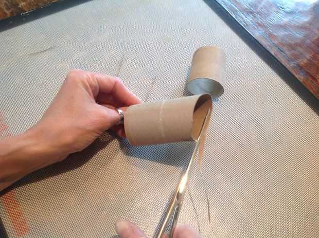 Conecte la pistola de pegamento por lo que es listo para el siguiente paso. Con unas tijeras, cortadas tubos de papel toalla y t.p. para diferentes longitudes, dejando a un lado en ángulo y el otro recto.