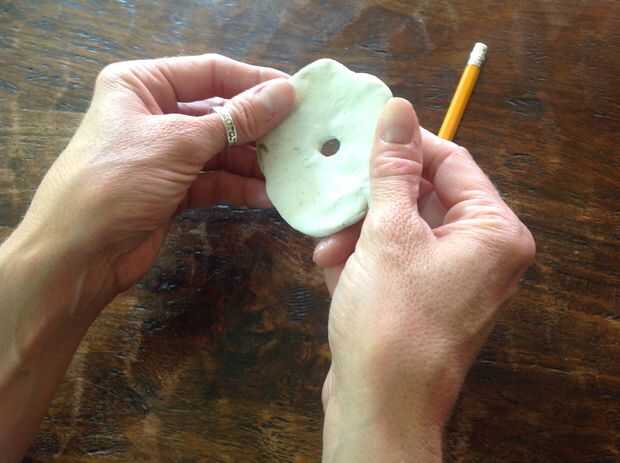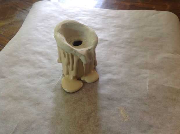 Tomar una bola de 1" o lo de la arcilla y trabajar en forma de tortilla que es un poco más grande que la parte superior de la vela y sobre 1/8" de espesor. Esto servirá como un soporte flexible pegamento caliente de la parte superior de la vela y definen la forma interna alrededor de la mecha. Tome un lápiz y haga un orificio en el centro, suficientemente grande para que la mecha de la candelita caber a través. Coloque el agujero en el centro de la parte superior del tubo y molde de la arcilla alrededor de los bordes, manchas y/o mezcla en la "cera" en la parte superior y abajo las gotas. Escultura de altos muros y pozos alrededor de la mecha, quemar agujeros, etc..