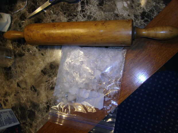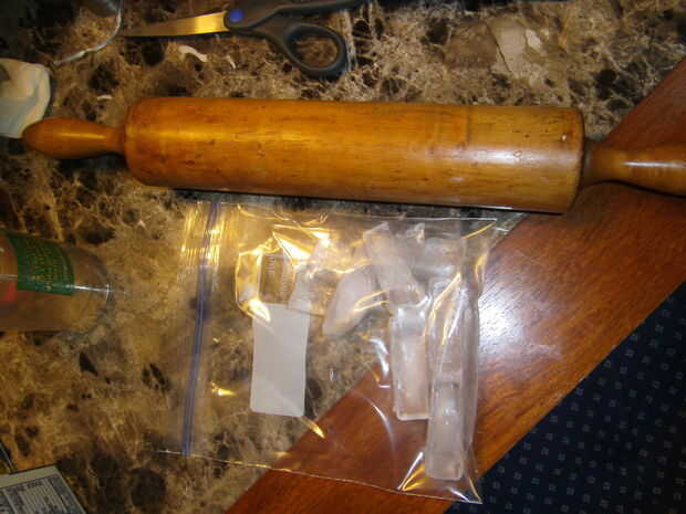 Ahora tenemos que machacar algo de hielo. Poner unos cubitos en una bolsa de congelador y me fui a la ciudad con un perno de balanceo. El tamaño del hielo que utilice determinará la forma de la vela. Si vas a grandes, tienes enormes cavernas. Esto no puede ser malo si piensa hacer un segundo vaciado. Trozos más pequeños conducen a las cavidades más pequeñas que serán aisladas uno del otro, que no permitirá que la cera conseguir, si quieres verter para llenar. Como se puede ver en la foto, fui a un terreno intermedio, con trozos y aplastamiento total.