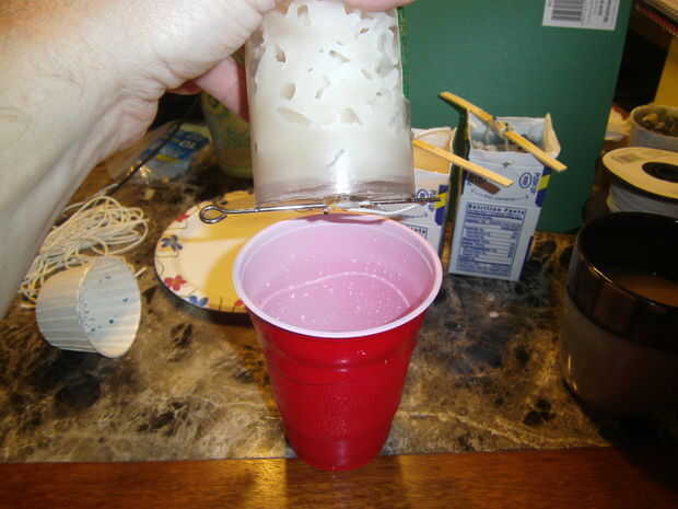 Después de dejar que el fresco de cera (un proceso que se hace más rápida por el fusión hielo dentro), vierta el agua y entonces establecer la vela boca abajo en un plato o bandeja con una toalla de papel para recoger cualquier goteo. Esto podría tomar un poco mientras que, como hay un montón de recovecos para ocultar en. Todo el tiempo para estas velas de enfriamiento, drenaje fue unos 45 minutos.