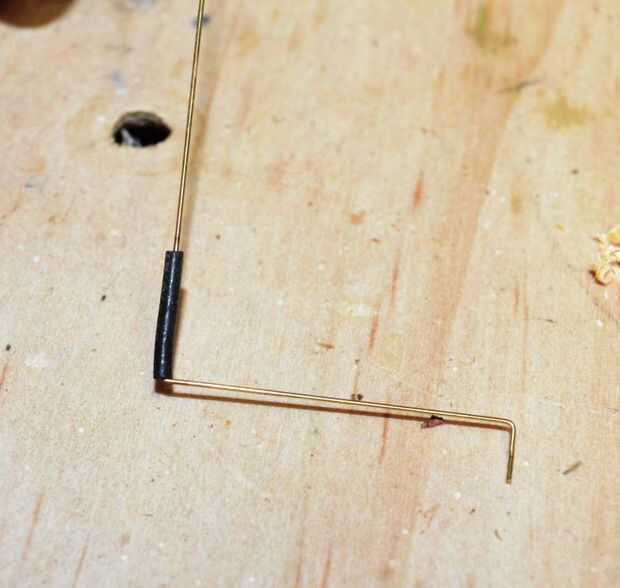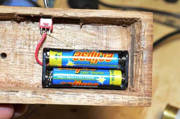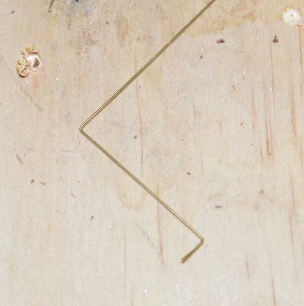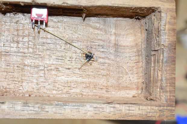 3. a continuación usted necesita doblar otra pieza de alambre de cobre por lo que viene a través de uno de los agujeros en la madera y se conecta al interruptor. Doblar el alambre para que se sienta contra la madera y el otro extremo la curva un poco por lo que se conecta a una de las patas del interruptor.