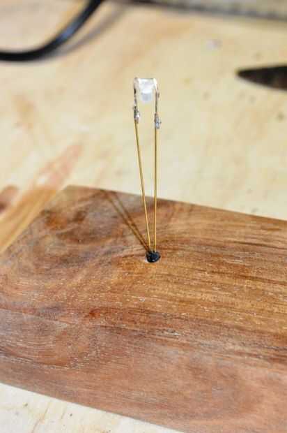 4. Añadir una pequeña tubería encogible al alambre donde va a través del agujero en la madera. Esto asegurará que no corta los 2 pedazos de alambre de cobre que conecta con el LED.