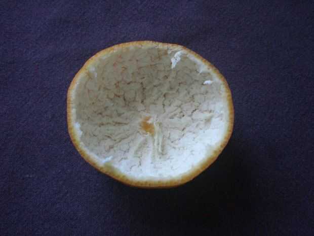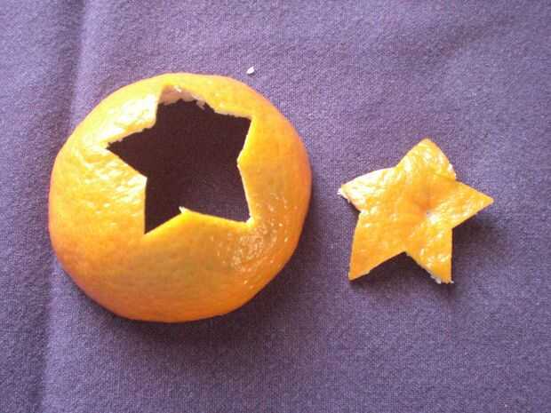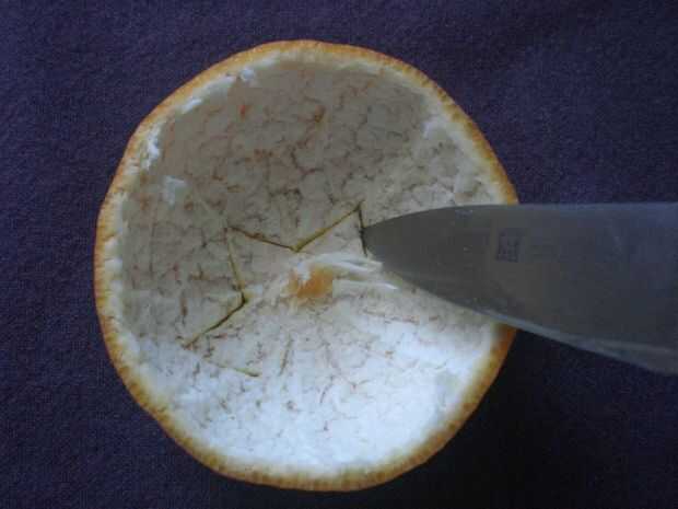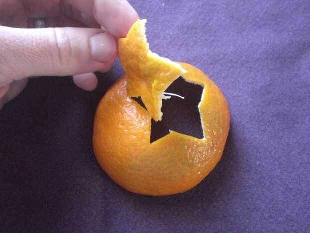 Aquí usted quiere cortar un agujero en el centro de la mitad de la mandarina sin el tallo. Este agujero permite que el calor y la llama para escapar.