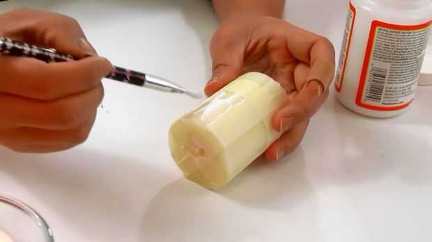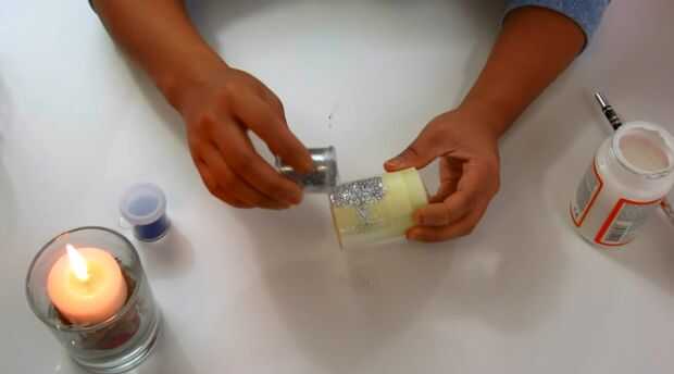 Tome su primer color de brillo y aplicar una cantidad generosa. Asegúrese de que tener un pedazo de papel bajo su vela cuando usted solicita el brillo por lo que se puede coger el brillo extra que se pierda o se apaga la vela. Toque la vela como vas a conseguir el brillo que no es off.