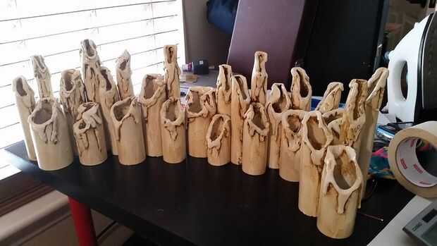Puedes pintar estas o calentar la tubería para crear la mirada que los bordes de la vela están empezando a caer. Dos ejemplos están en las fotos de arriba. El negro fue creados por un estudiante en mi clase WCHC Sandie Schneider rarezas, los fundidos creados por Steven Stockinger de Reino de miedo Inicio rondan.
