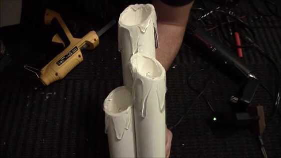 A continuación tome el pegamento caliente y unos palillos de pegamento y ejecutar un cordón alrededor del borde de cada vela, esto ocultará los cortes de PVC. Toma la pistola de pegamento caliente y presione en un área justo en el borde pero en el lado y dejarlo fluyen. No toque el tubo con la pistola, sólo flotar lejos pero cerca. Se piscina luego empezar el goteo. Más cuanto más pones el goteo. Para ello en cada vela.
