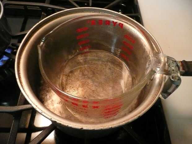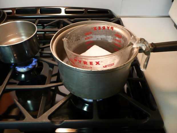 * También, tener un recipiente extra con agua hirviendo a un lado es una buena idea. Esto es así no tienes que sacar tu cera completamente la caldera si necesita más agua. Simplemente levante el Pyrex (no se olvide de un agarrador! estará muy caliente!) y verter más agua si es necesario.