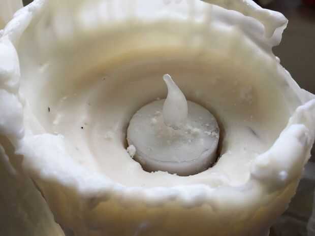Haber adquirido un conjunto de LED 'velas' el siguiente paso era quitar un agujero limpio en cada vela, que les acomodaría. Pensé muchas maneras posibles de hacer el agujero, pero la más sencilla resultó ser hacking hacia fuera con una cuchara.