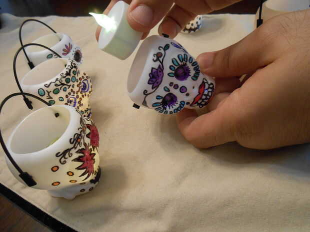 Siempre he amado la estética de calaveras de azúcar y lo que representan. Yo quería crear algo inspirado en el día de los muertos para Halloween.Tuvimos algunos cuero sobrante de unas sillas, que quería reutilizar. Este es mi primer intento de crear