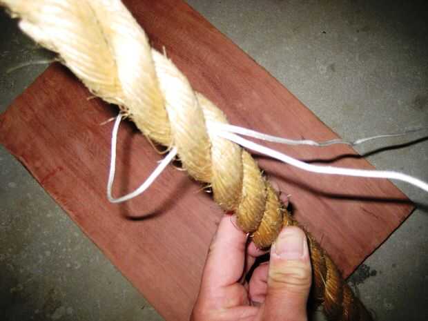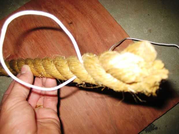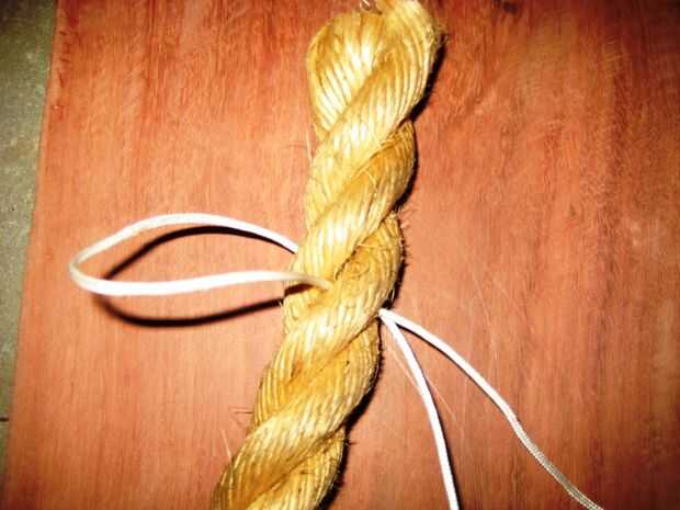 • Meter el extremo de la cuerda a través de la cuerda pasando bajo uno de los filamentos. Unos 200mm desde el extremo de la cuerda.