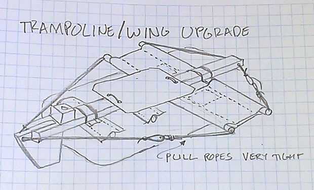 Sentirás su velero un poco más estable mediante la adición de alas. Podrá apoyar los pies en estos pequeños trampolines y obtener un mejor control de su barco. Hacer dos de los listones de 4 pies de largo en vez de 2 pies de largo y en lugar de bolsillos de polo simple de coser, hacer una manga grande 16" ancho y 45" de largo. Reemplace las dos mangas pequeñas en la parte trasera con este una gran manga. Cuerda de la loop a través de cada listón y crear una estructura de tensión por atar la cuerda a través de un agujero de 2 x 4 y con cincha lo para arriba realmente apretado.